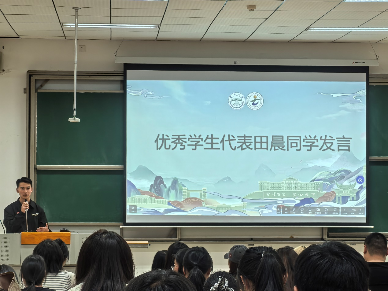 会议第四项议程,优秀学生代表2022级博士生田晨发言。田晨回顾了自己在云南大学多年的学习与科研历程,并分享自己在考研过程中与导师沟通、调整心态的真实经历,鼓励大家以积极平和的心态面对学术道路上的挫折与机会。田晨结合自身经历建议同学们:一要向师长与优秀同学学习,二要善用AI等先进工具以提高效率,三要保持观察自然和强烈好奇心。最后勉励同学“心中有科学,眼中无学科”,珍惜青春、提升学习能力。