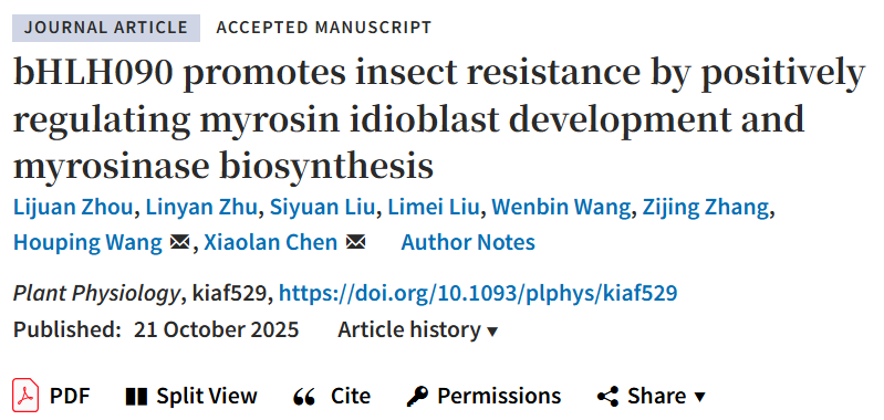 2025年10月21日,云南大学生命科学学院陈小兰课题组与云南生物资源保护与利用国家重点实验室王后平研究组合作,在《Plant Physiology》发表了题为“bHLH090 promotes insect resistance by positively regulating myrosin idioblast development and myrosinase biosynthesis”的研究论文,揭示拟南芥转录因子 bHLH090通过调控黑芥子酶异细胞发育与黑芥子酶生物合成,增强抗虫性的分子机制。阐明 “FAMA–bHLH090–TGG1” 调控模块的功能,为十字花科作物抗虫育种提供重要理论依据与分子靶点。