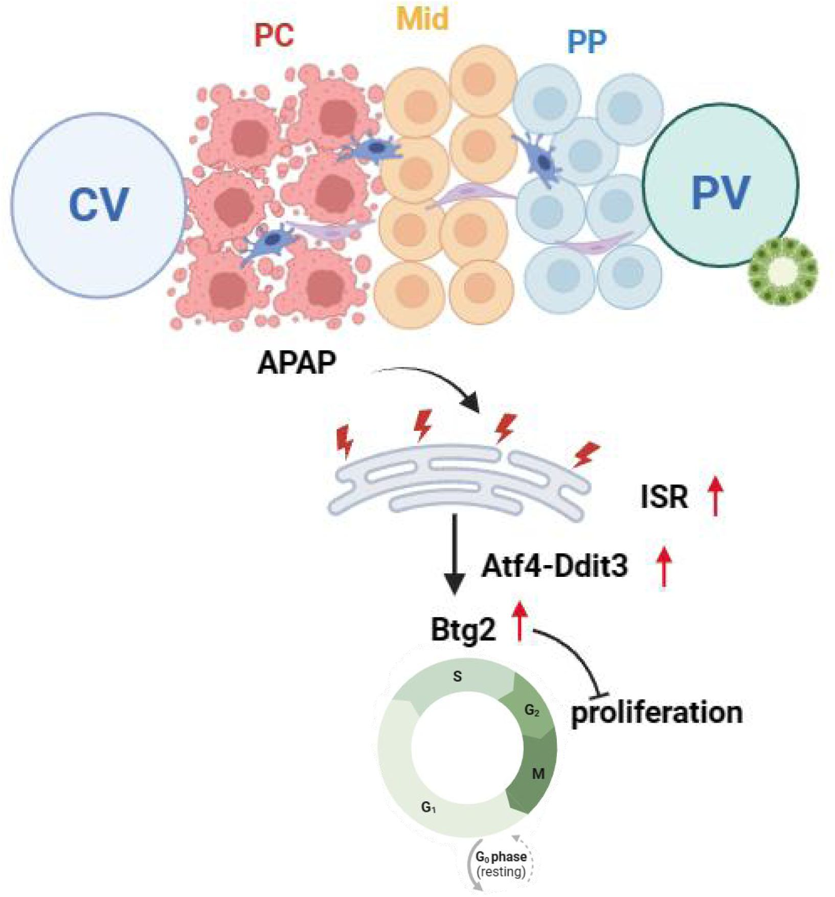 进一步的空间转录组分析揭示,这种暂时的“静止”状态并非被动停滞,而是由一套主动的应激响应程序控制。研究团队发现,Atf4–Chop(Ddit3)信号轴在中部肝细胞中被强烈激活。该通路属于整合性应激反应(Integrated Stress Response, ISR)的一部分,能在能量受限或蛋白折叠压力下重编程细胞的基因表达,使其优先保障生存。