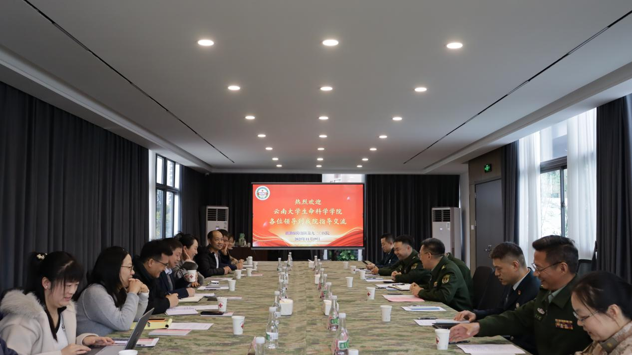 2025年11月19日,云南大学生命科学学院党委书记王贤智、党委副书记何雨洋、副院长王永华,以及陈庆锋研究员、陶勇研究员等一行9人前往中国人民解放军联勤保障部队第九二〇医院进行合作回访交流。此次访问旨在进一步推动双方在人才培养、科研协作等方面的深度合作,并就研究生联合培养机制、双方导师合作模式等具体议题进行了务实而富有成效的讨论。