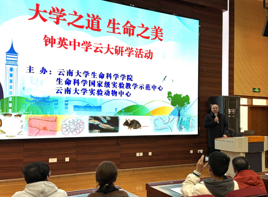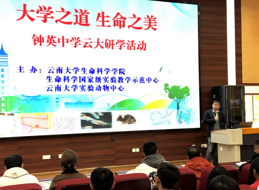 2025年12月8日下午,昆明市官渡区钟英中学150余名高二学子在阳远兵副校长及三位班主任的带领下,赴云南大学生命科学学院开展以“微观世界探秘-从课本实验到前沿科研”为主题的研学活动。活动于下午2点在云南大学生命科学学院1栋报告厅正式启动,由学院副院长王永华主持。此次活动通过讲座分享、实地参观等形式,搭建起中学课堂与高校科研的沟通桥梁,让学子们近距离感受生命科学的魅力。