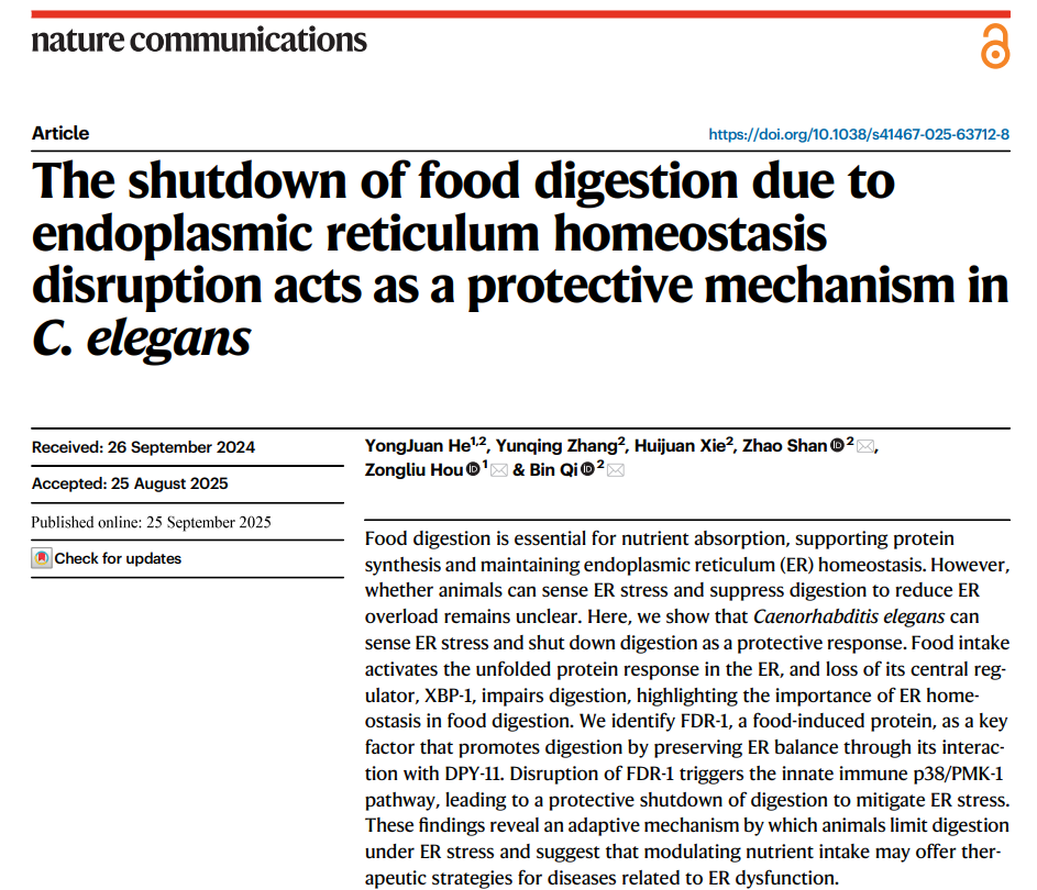 2025年9月,云南大学生命科学学院/生命中心(祁斌、单昭课题组)与昆明市延安医院(侯宗柳教授)合作,在Nature Communications发表了题为“The shutdown of food digestion due to endoplasmic reticulum homeostasis disruption acts as a protective mechanism in C. elegans”的研究论文,揭示了细胞在应激状态下通过主动抑制消化功能以维持生存的“少吃哲学”。
