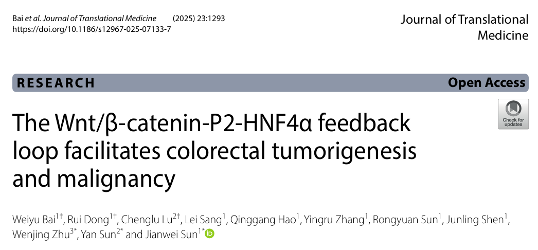 2025年11月,云南大学生命科学学院孙建伟研究团队联合天津医科大学孙燕与康复大学朱文静团队在结直肠癌研究领域取得重要进展。相关研究型论文“The Wnt/β-catenin-P2-HNF4α feedback loop facilitates colorectal tumorigenesis and malignancy”近日在线发表于国际权威期刊 Journal of Translational Medicine。