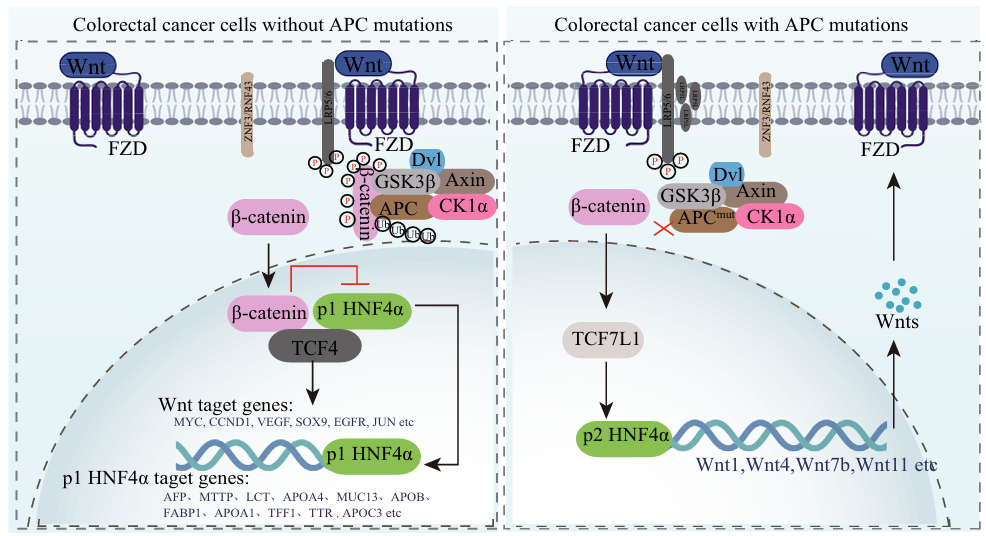研究显示,来源于 P2 启动子的 HNF4α(P2-HNF4α)在 CRC 中显著上调,具有强烈促肿瘤特性,可驱动细胞增殖并促进肿瘤生长。路径分析进一步明确,Wnt/β-catenin 信号通过转录因子 TCF7L1 直接激活 P2-HNF4α 的表达,而 P2-HNF4α 反过来又增强多个 Wnt 配体(如 WNT1、WNT4、WNT11)的转录活性,从而持续放大 Wnt 信号强度,使肿瘤细胞在 APC 突变背景下获得更强的增殖和存活优势。