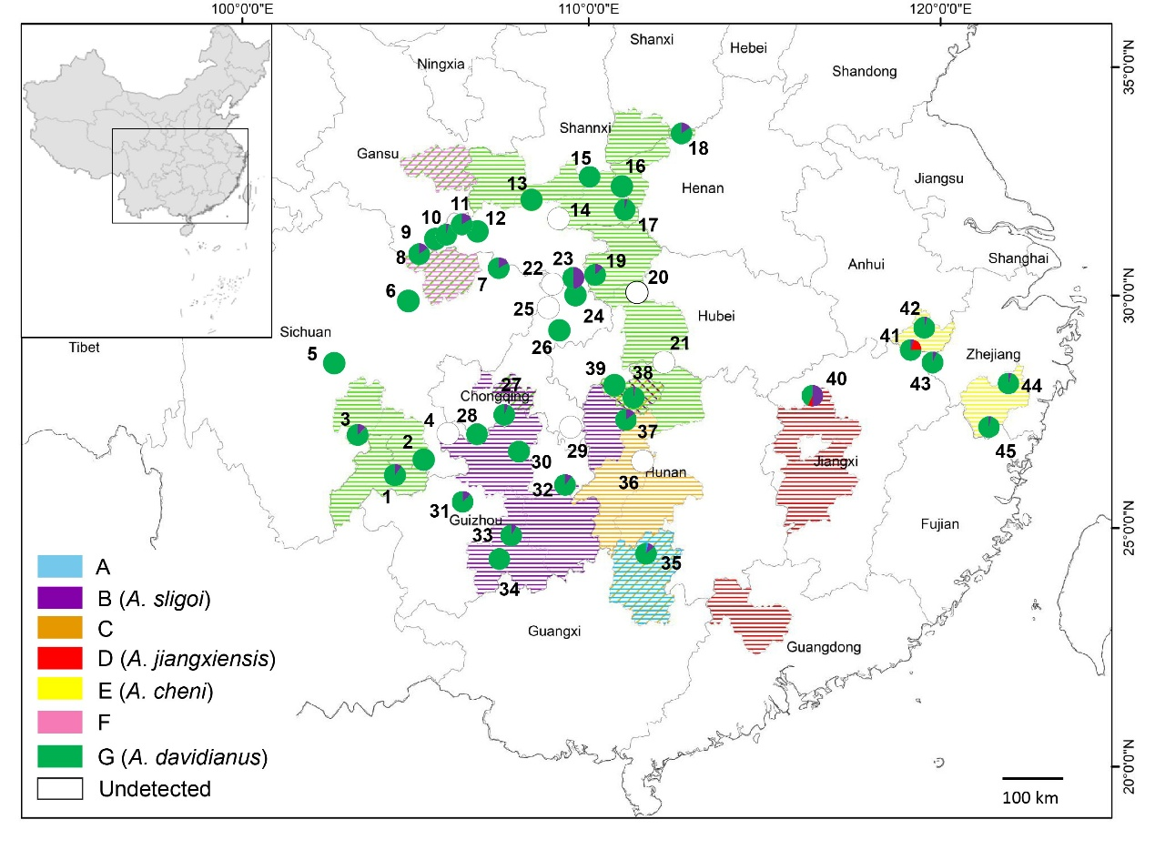 图2 基于eDNA揭示大鲵各隐存种当前野外分布与历史范围对比图(引自论文Figure 2)。图中颜色代表不同隐存种(定义参照Yan et al., 2018与Liang et al., 2019)。阴影区域为历史分布范围,数字编号点为本次eDNA采样点,圆形色块表示该点检测到的物种。
