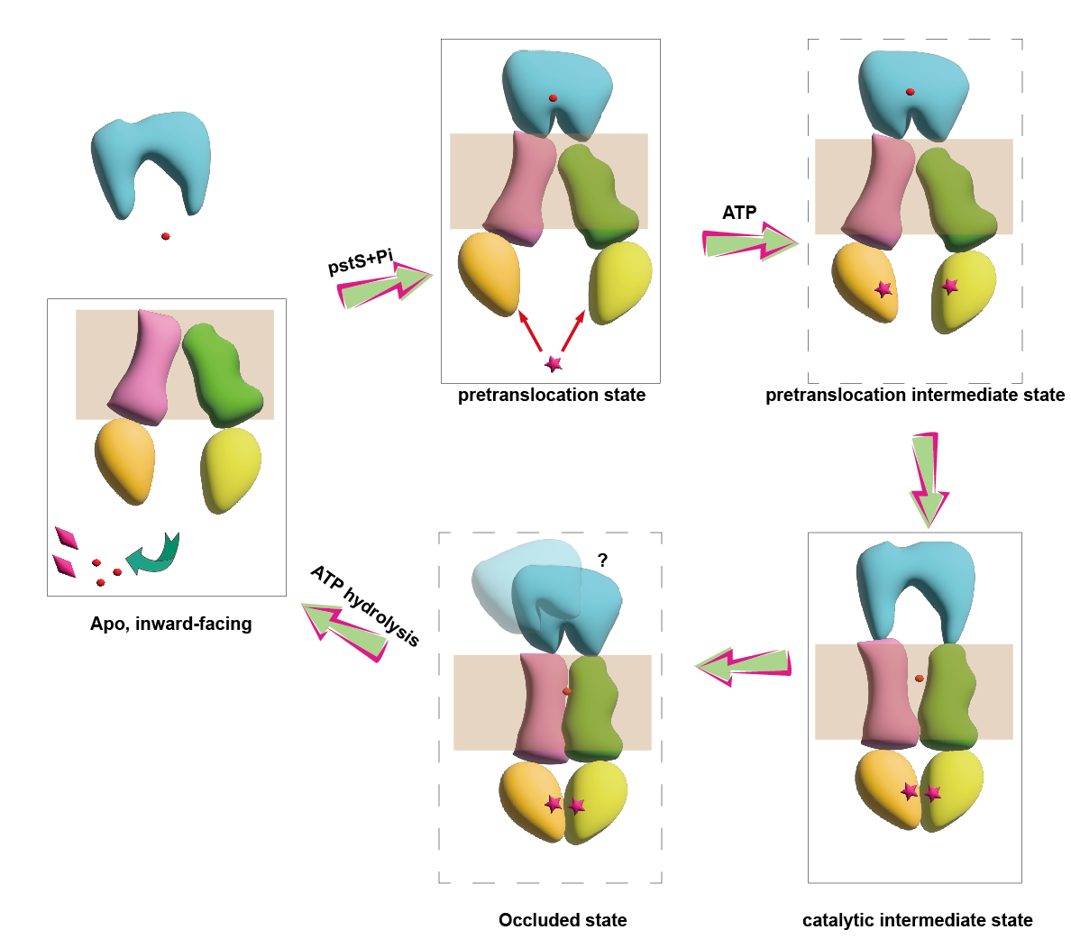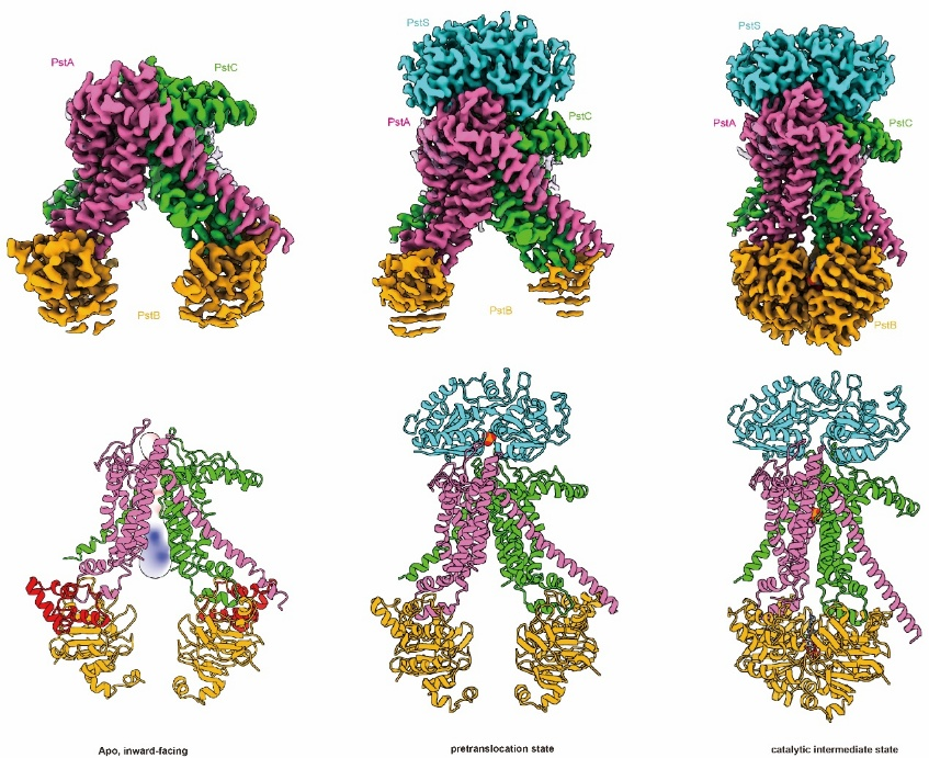 磷作为细胞内第五大丰富元素,是所有生命体不可或缺的营养物质,其调控失衡关乎人类疾病、农业产能及微生物存活,兼具医学、农业与药物研发价值。无机磷酸盐(Pi)是环境中磷的主要存在形式,大肠杆菌中存在低亲和力PiT 系统与高亲和力Pst系统负责Pi摄取,PstSCAB 作为 Pst 系统的核心ABC转运蛋白,受双组分调控系统介导的Pho调控子调控,仅在磷限制条件下激活,其构象变化或为调控信号,且与同操纵子的PhoU密切相关。PstSCAB功能异常会破坏Pho调控子对群体感应、毒素分泌等毒力基因的调控,显著削弱病原菌的毒力,是潜在的药物靶点。该转运蛋白复合物由周质亚基PstS(捕获并递送Pi)、PstA/PstC形成的跨膜结构域(TMD)及PstB胞质亚基(水解ATP供能)组成,尽管PstS的结构研究已较为深入,但PstSCAB完整复合物不同功能状态的结构与Pi转运分子机制仍不明确,导致多个关键科学问题尚未解决:完整蛋白复合物如何组装?跨膜结构域中磷酸盐的结合与特异性识别是如何实现的?磷酸盐的摄取过程需要哪些构象变化?
