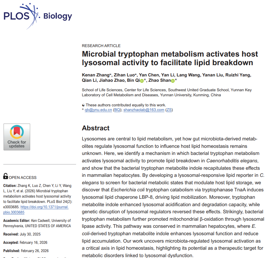帮助“燃烧脂肪”的秘密武器,或许就藏在肠道里的微生物身上。2026年2月,云南大学生命科学学院单昭、祁斌课题组合作在PLOS Biology发表重要研究成果,揭示了肠道细菌通过色氨酸代谢产物——吲哚,激活宿主细胞溶酶体功能、进而促进脂质分解的全新机制。这一调控通路从线虫到哺乳动物肝细胞中高度保守,为脂肪肝、肥胖等代谢性疾病的治疗开辟了全新方向。