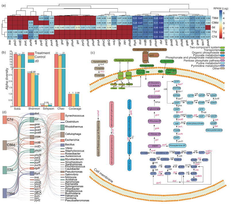 图 1. 与磷相关的病毒辅助代谢基因的丰度、多样性及代谢途径。(a)各组中与磷相关的辅助代谢基因(AMGs-P)的分布情况。(b)AMGs-P 的α多样性。(c)本研究中所鉴定的病毒携带的基因所涉及的磷代谢途径,其中相关基因以红色突出显示。(d)推断的遗传起源关系。