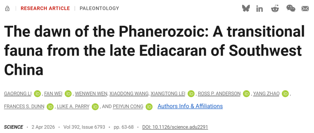 论文信息:Li G., Wei F., Wen W., Wang X., Lei X., Anderson R., Zhao Y., Dunn F., Parry L. & Cong P. 2026. The dawn of the Phanerozoic: A transitional fauna from the late Ediacaran of Southwest China. Science 392 (6793): 63-68. DOI: 10.1126/science.adu2291