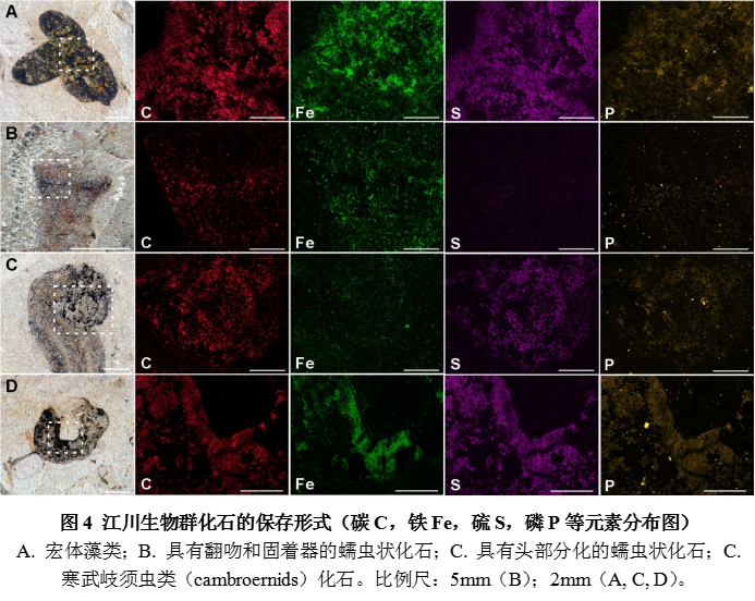 为什么云南东部埃迪卡拉纪的地层能保存动物门类起源的证据?为进一步回答这一重要科学问题,研究团队使用扫描电子显微镜-X射线能谱分析以及沉积相分析等多种手段,揭示了江川生物群中的化石主要以碳质薄膜的形式保存,并伴随有黄铁矿化和磷酸盐化(图4),是寒武纪特异埋藏化石库的典型方式。这与华南以及全球范围内埃迪卡拉纪其他主要化石宝库的保存方式存在显著不同:世界范围内埃迪卡拉纪化石主要以印痕的形式保存。江川生物群的生物组合和化石保存方式代表着一种在埃迪卡拉纪末期开始出现的“寒武纪型”动物群落。江川生物群中丰富的两侧动物化石组合支持达尔文一个多世纪以前的推断:后生动物化石在寒武纪之前地层中的“缺失”是由于化石记录不完整所造成的假象。