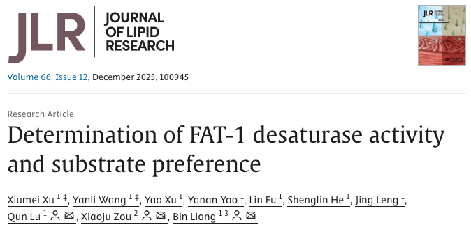 2025年11月14日,云南大学生命科学学院梁斌研究员和路群研究员、云南中医药大学的邹晓菊教授联合在脂质代谢领域国际知名期刊《Journal of Lipid Research》发表题为 “Determination of FAT-1 desaturase activity and substrate preference”的研究论文,首次揭示了模式生物秀丽线虫(C. elegans)中FAT-1去饱和酶的活性关键位点及其底物偏好机制,也为利用FAT-1转基因育种及代谢疾病干预策略提供理论支持。
