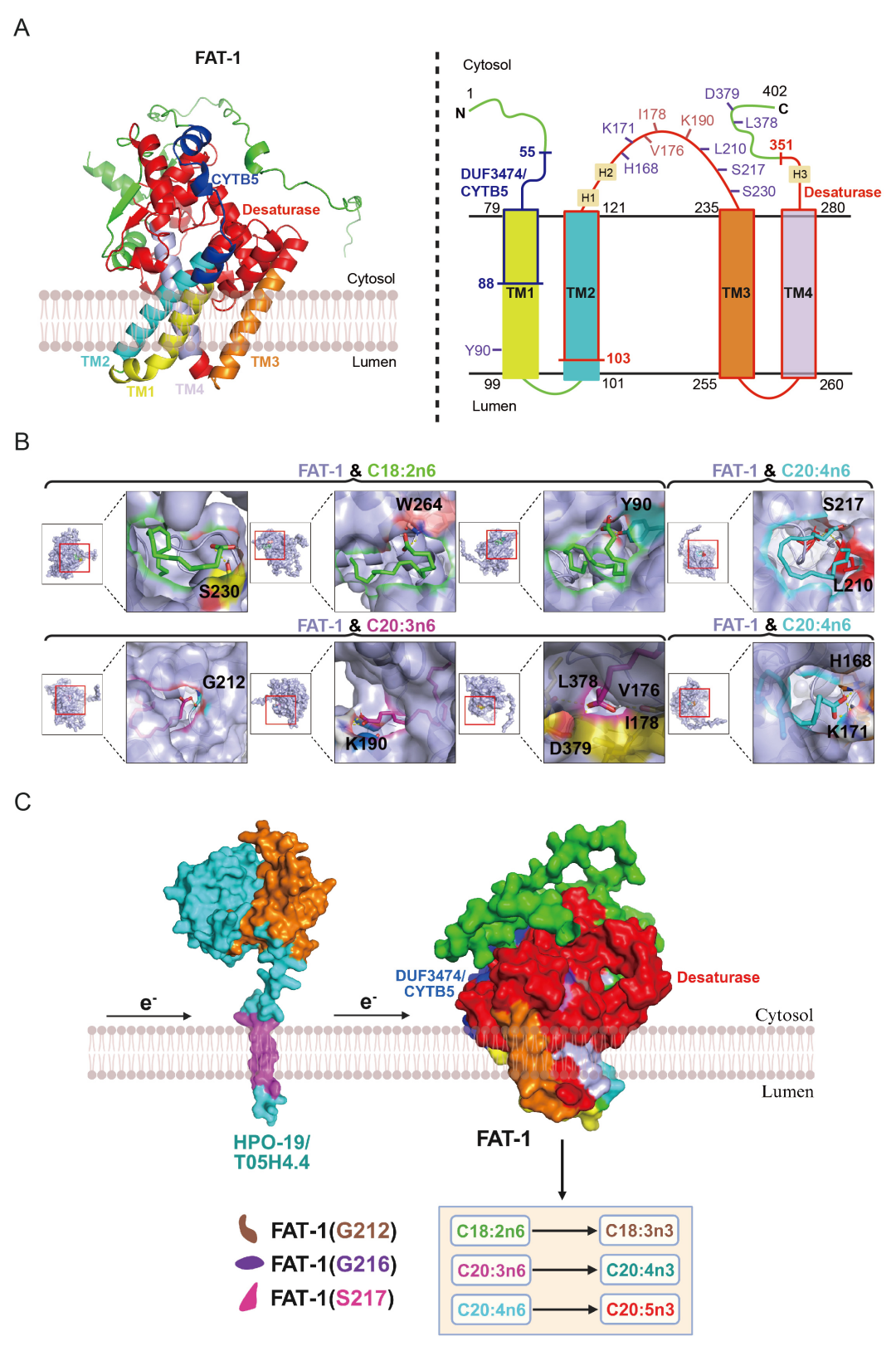 图1. FAT-1蛋白结构预测、底物结合模拟及其在n-3 PUFAs合成中的工作机制模型。