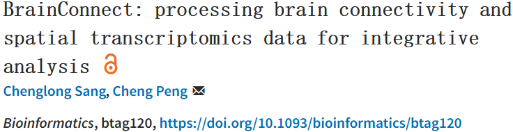 2026年3月10日,云南大学生命科学学院彭城团队在国际学术期刊Bioinformatics以Advance Access形式在线接受发表了题为“BrainConnect: processing brain connectivity and spatial transcriptomics data for integrative analysis”的研究论文。该研究开发了一款名为BrainConnect的开源软件,实现了对小鼠单神经元成像、脑连接组、脑空间转录组等多模态数据的整合处理与分析,并基于长短时记忆网络构建了空间基因表达预测大脑区域间连接强度的计算模型,为分析和预测大脑连接组提供计算工具。