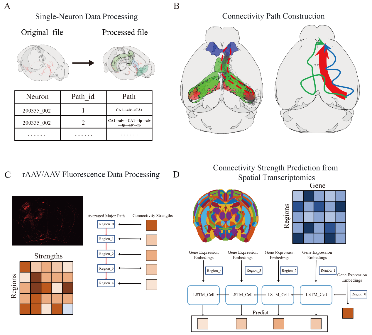 图1.BrainConnect软件功能模块。(A)单神经元数据处理。(B)脑连接路径构建。(C)荧光连接强度数据处理。(D)基于空间转录组的连接强度预测模型。